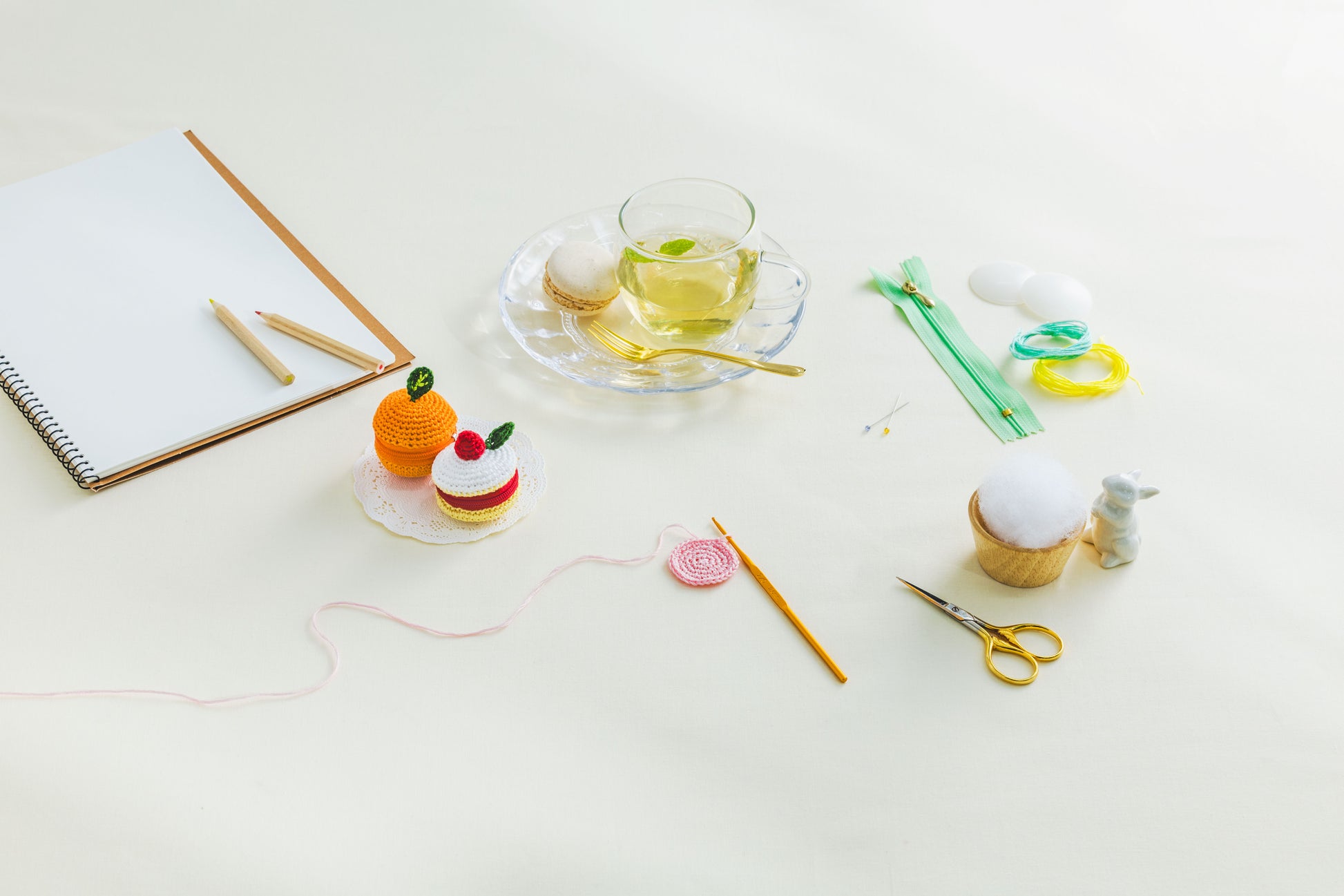 【コロンとしたかわいいカタチ】 手のひらに乗るかわいいカタチには、カラフルマカロンのように少し平たいたプと、たこやきのように丸いタイプの2種類があります。どちらも外側と内側をそれぞれ編んで、パーツを組み合わせて仕立てます。(平たいタイプ:カラフルマカロン、ケーキ、ハンバーガー/丸いタイプ:オレンジ、トマト、たこやき