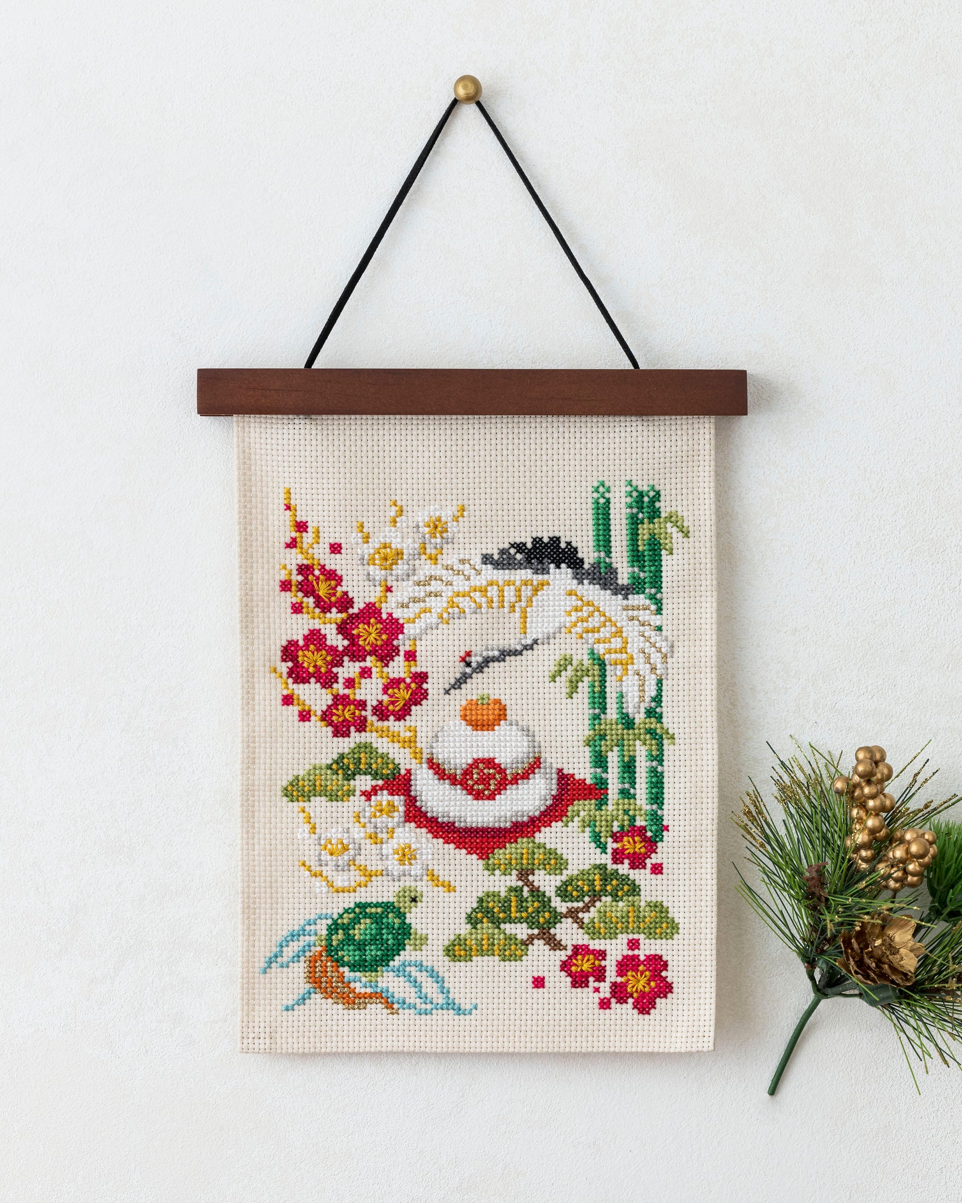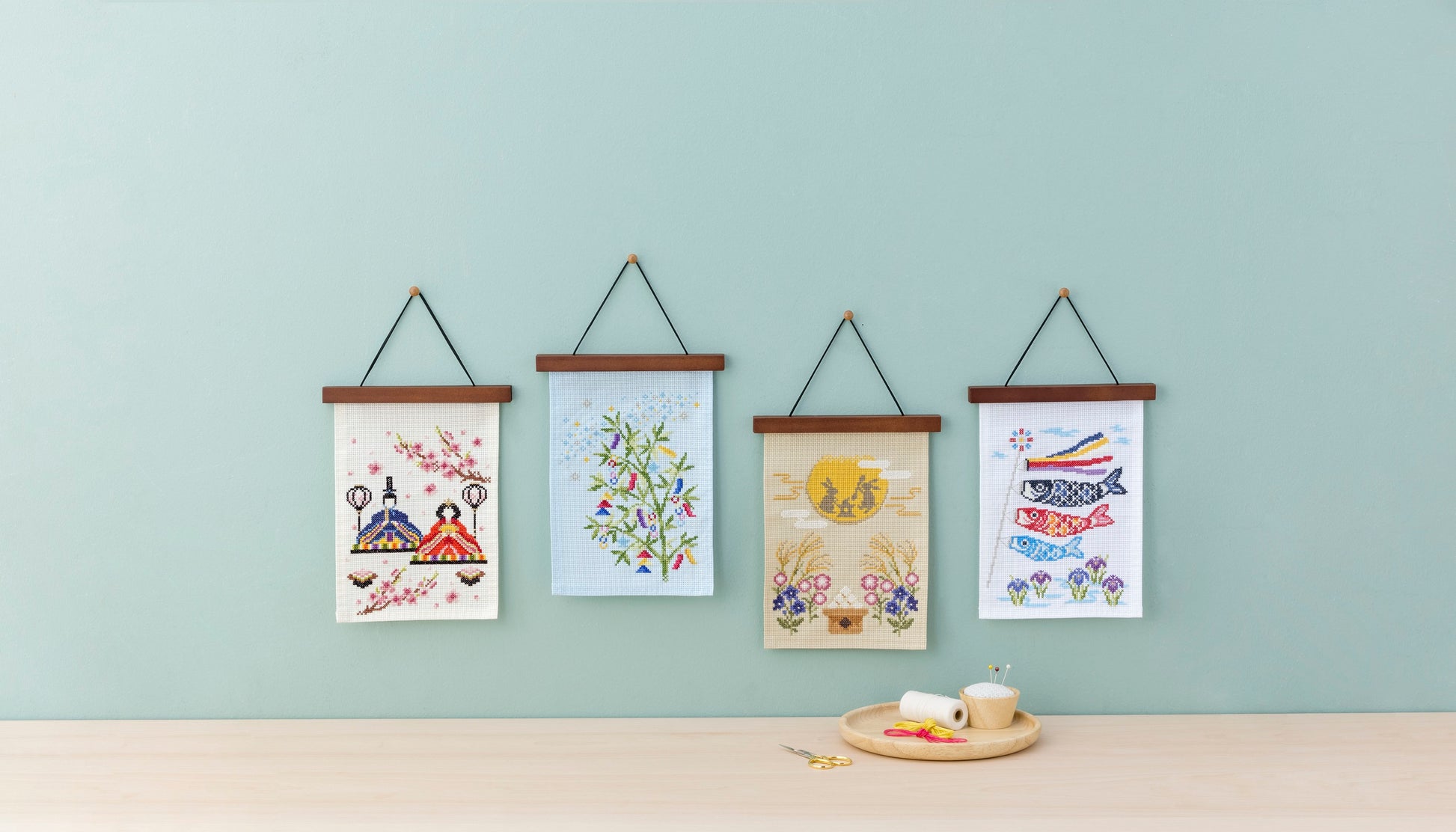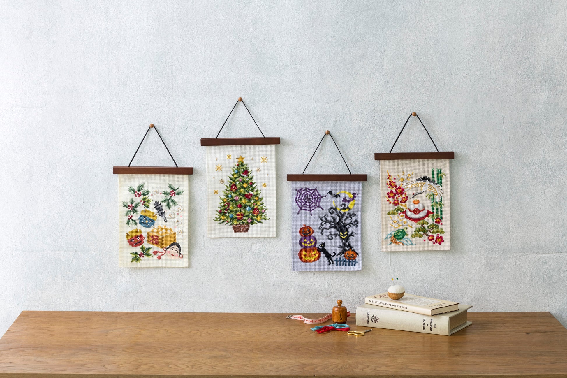 季節のイベントをクロスステッチのタペストリーにしました。お部屋のインテリアに合わせやすい、シックなカラーの木製ウォールバーで仕立てるので、和のイベントもモダンな雰囲気になり、玄関・リビング・和室など場所を選ばずに飾って頂けます。
