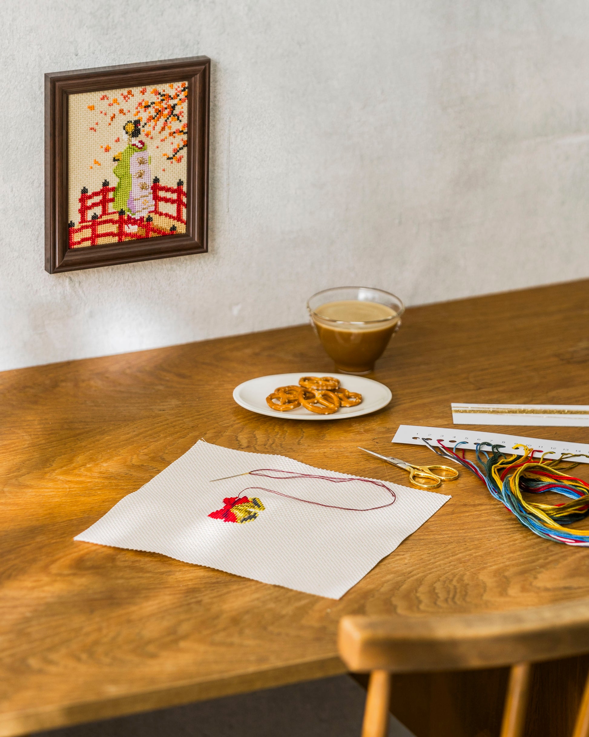 日本ならではの風景や思い出を描きました。季節ごとに掛け替えるのが楽しいクロスステッチキットです。お部屋に飾れば季節のおもてなしに◎